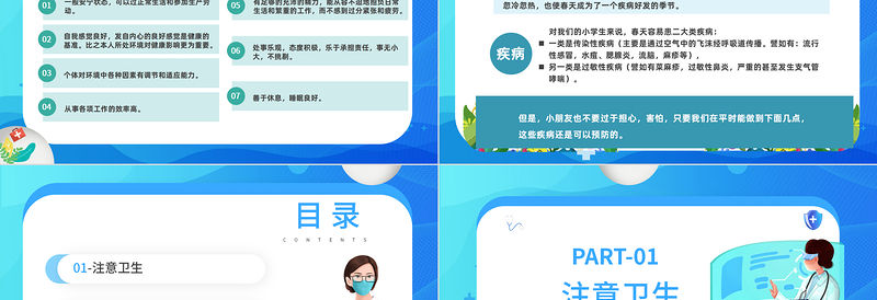 PART-01注意衛生春天是萬物生長的季節,因此細菌、病毒也不例外,它們加速繁殖,再由于氣候變化無常,忽冷忽熱,也使春天成為了一個疾病好發的季節。但是,小朋友也不要過于擔心,害怕,只要我們在平時做好預防,這些疾病還是可以預防的。