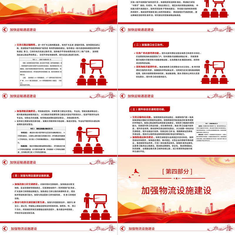 完善運輸場站設施 。加強鐵路貨運場站建設 ,新建和改擴建一 批具有集裝箱辦理能力的鐵路貨運基地,增強鐵路班列始發直達和 集零成整的中轉能力。加強公路運輸場站和配套設施建設 ,增強貨 流集散的保障能力。完善提升港 口貨運功能 ,優化堆場布局 ,推進 港 口設備升級改造 ,提升作業效率。推動各種交通設施優化整合, 大力發展一體化綜合交通樞紐 ,提升設施運行效率。完善邊境 口岸 站、鐵路換裝站及其他交通設施 ,提高對公路跨境運輸和國際鐵路 聯運的保障能力。 加強集疏運體系建設 。統籌交通樞紐與各類園區的空間布局, 按照無縫化銜接要求 ,加強直達港區、重點園區、大型企業的鐵路專用線建設 ,推進裝卸場站共用 ,打造一體化集疏運體系。加強鐵 路貨運基地、主要港 口集疏運公路建設,提高聯運便捷性、安全性。 推進港城融合、協調發展 ,合理建設重點港 口城市繞城公路 ,減少疏港貨物運輸對城市交通的干擾。加快運輸通道建設( 三 ) 提升綜合交通樞紐功能。