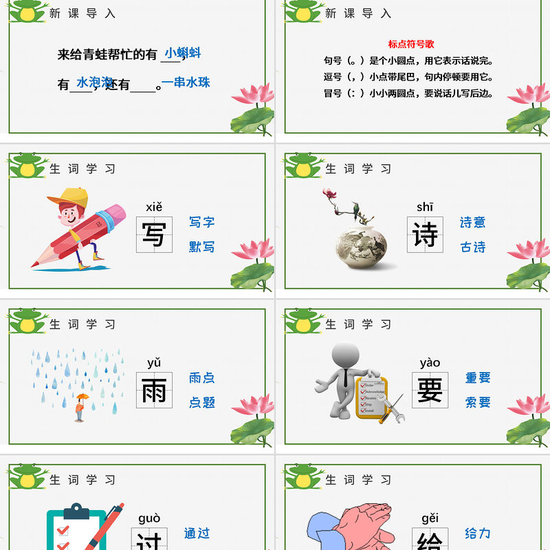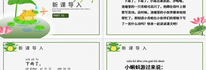 新課導入 下雨了,下雨了,小雨點淅瀝瀝、沙啦啦,池塘里的一只青蛙可高興了,他蹲在荷葉上想要寫首詩。這時候,池塘里的小伙伴都來給他幫忙了。想知道小青蛙在小伙伴們的幫助下寫了一首什么詩嗎?快來一起讀讀課文吧!
