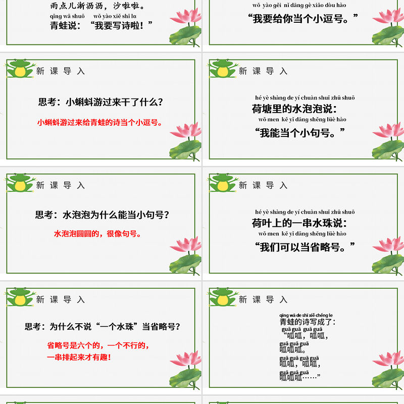 新課導入 荷塘里的水泡泡說:“我能當個小句號。”hé yè shànɡ de yí chuàn shuǐ zhū shuō wǒ men kě yǐ dānɡ shěnɡ lüè hào