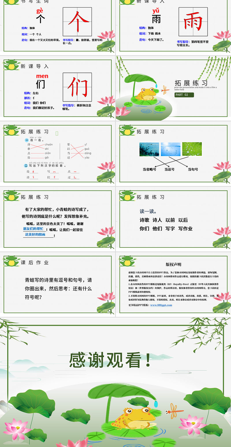 新課導入青蛙的詩寫成了:“呱呱,呱呱,呱呱呱。呱呱,呱呱,呱呱呱……”qīnɡ wā de shī xiě chénɡ le guā guā guā guāguā guā guāguā guā guā guāguā guā guā