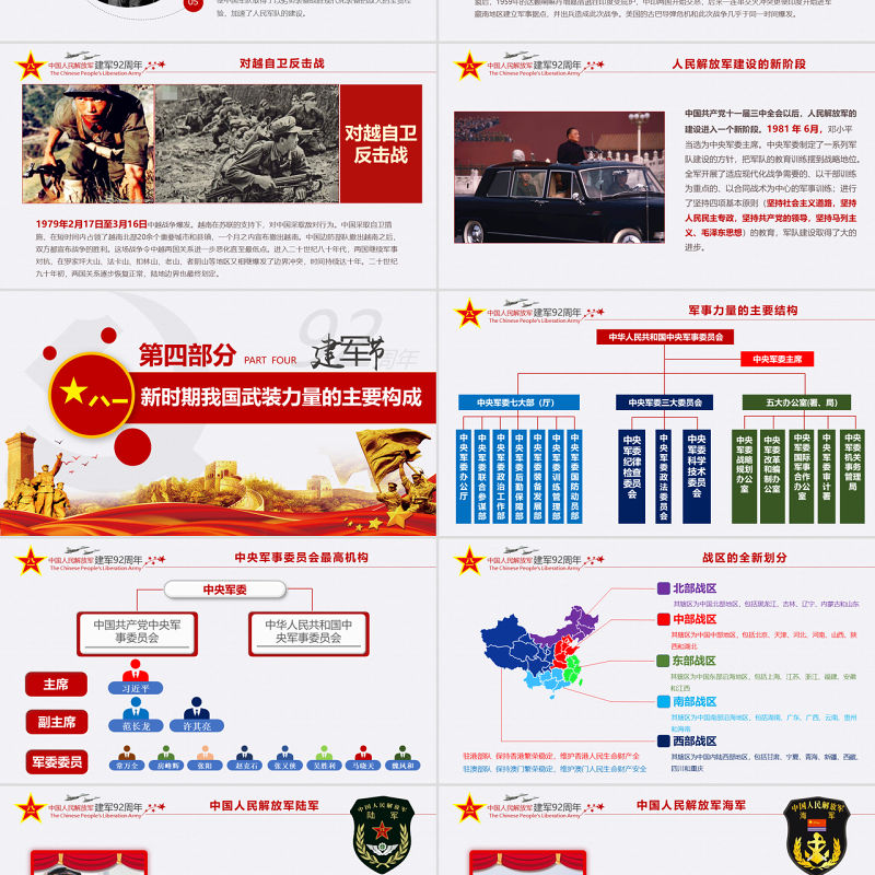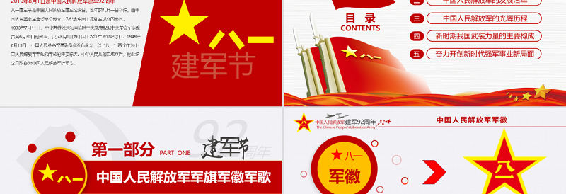 PREFACE前言2019年8月1日是中國人民解放軍建軍92周年八一建軍節是中國人民解放軍建軍紀念日,每年的八月一日舉行,由中國人民革命軍事委員會設立,為紀念中國工農紅軍成立的節日。1933年7月11日,中華蘇維埃共和國臨時中央政府根據中央革命軍事委員會6月30日的建議,決定8月1日為中國工農紅軍成立紀念日。1949年6月15日,中國人民革命軍事委員會發布命令,以“八一”兩字作為中國人民解放軍軍旗和軍徽的主要標志。中華人民共和國成立后,將此紀念日改稱為中國人民解放軍建軍節。中國人民解放軍建軍92周年建軍節