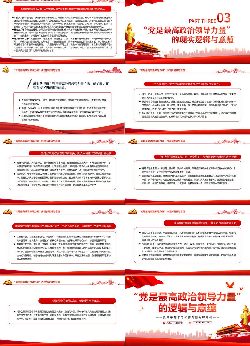 <p>——黨員干部學習教育專題黨課課件——“黨是最高政治領導力量”的邏輯與意蘊</p><br><p>這一論斷是習近平新時代中國特色社會主義思想的核心內容之一。在黨的理論發展史上,黨的新論斷的生成都有著深厚的理論邏輯、歷史邏輯和現實邏輯,都蘊含著豐富內涵,展現了黨的話語創新,“黨是最高政治領導力量”這一新論斷也是如此。黨的十八大以來,習近平總書記提出并反復強調“黨是最高政治領導力量”。</p><br><p>目錄CONTENT </p><br><p>01“黨是最高政治領導力量”的理論邏輯與意蘊PART ONE</p><br><p>“黨是最高政治領導力量”的理論邏輯與意蘊</p><br><p>“黨是最高政治領導力量”的理論邏輯與意蘊</p><br><p>“黨是最高政治領導力量”的理論邏輯與意蘊</p><br><p>習近平總書記提出“黨是最高政治領導力量”這一新論斷,是對馬克思主義政治觀、政黨觀的繼承和發展,是對馬克思主義經典作家關于黨的領導思想的中國化、時代化,是中國共產黨人對馬克思主義黨的學說的新貢獻。“黨是最高政治領導力量”的理論邏輯與意蘊</p><br><p>02“黨是最高政治領導力量”的歷史邏輯與意蘊PART TWO</p><br><p>1840年鴉片戰爭以后,中國逐漸成為半殖民地半封建社會。中國社會原有的和新生的多種政治力量開始進行救亡圖存的英勇抗爭。太平天國運動、戊戌變法、義和團運動接連而起,但一次又一次地都失敗了。“1911年,孫中山先生領導的辛亥革命,推翻了統治中國幾千年的君主專制制度。舊的制度推翻了,中國向何處去?中國人苦苦尋找適合中國國情的道路。君主立憲制、復辟帝制、議會制、多黨制、總統制都想過了、試過了,結果都行不通”,以建立資產階級共和國為目標的革命在中國革命實踐中最終也沒有逃脫失敗和破產的命運。這么多努力失敗的最主要原因,就是沒有先進的堅強的政黨作為最高政治領導力量。中國共產黨的成立從根本上改變了這種局面,中國革命的面貌從此煥然一新。“黨是最高政治領導力量”的歷史邏輯與意蘊“黨是最高政治領導力量”這一新論斷,是對近代以來中國人民長期奮斗實踐邏輯的準確把握。</p><br><p>“黨是最高政治領導力量”的歷史邏輯與意蘊</p><br><p>“黨是最高政治領導力量”的歷史邏輯與意蘊</p><br><p>03“黨是最高政治領導力量”的現實邏輯與意蘊PART THREE</p><br><p>政治屬性是政黨的第一屬性,體現著政黨的本質,決定著政黨的前途命運。注重講政治是我們黨的傳統和優勢。黨的十八大以來,習近平總書記著眼于新時代黨和國家事業發展全局,把講政治提到新的歷史高度,把政治建設作為根本性統領性建設,提出并反復強調“黨是最高政治領導力量”。這里既包含新時代條件下黨對自身屬性認識的深化和前所未有的自覺,也包含新時代黨的使命擔當和執政自信。“黨是最高政治領導力量”的現實邏輯與意蘊</p><br><p>進入新時代,黨的使命是繼續推進實現中華民族偉大復興。“黨是最高政治領導力量”的現實邏輯與意蘊</p><br><p>堅持把崇高政治理想扛在肩頭,把人民利益作為最高價值追求。“黨是最高政治領導力量”的現實邏輯與意蘊</p><br><p>堅持黨的全面領導,把“兩個維護”作為最高政治原則和政治規矩。“黨是最高政治領導力量”的現實邏輯與意蘊</p><br><p>堅持黨在國家治理體系中的領導核心地位,形成“總攬全局、協調各方”的黨的領導體系。“黨是最高政治領導力量”的現實邏輯與意蘊</p><br><p>堅持和完善黨的領導制度體系,確保黨的領導堅強有力。“黨是最高政治領導力量”的現實邏輯與意蘊</p><br><p>“黨是最高政治領導力量”的現實邏輯與意蘊</p><br><p>——黨員干部學習教育專題黨課課件——“黨是最高政治領導力量”的邏輯與意蘊</p><br>