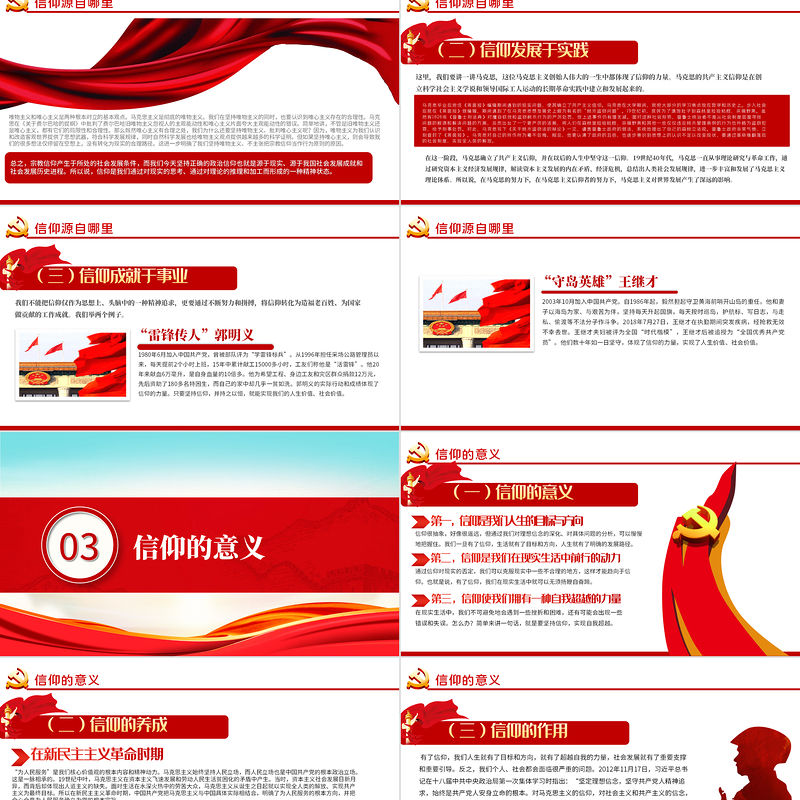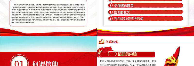 何謂信仰宗教信仰是指信奉某種宗教的人對自己所信仰的教理教義,由認同和崇拜而產生的堅定不移的信念以及全身心的皈依。在宗教問題上,我們要注意三個非常重要的原則:第一,公民有信仰宗教的自由;第二,共產黨員不能信仰宗教;第三,不能在宗教活動場所以外進行宗教活動。宗教信仰是一個非常重要的問題,盡管社會上有宗教信仰的人相對較少,但宗教信仰帶來的影響力不小,如果我們處理不好,就有可能引發文化沖突、民族矛盾,甚至會危害國家統一。所以,對于這個問題,我們要引起足夠的重視。政治信仰是人們對既定的政治形態的認同,是對政治的終極關懷。它包括我們對政黨及其理論、政策的一種認識和理解。當前及今后,我們應該堅持馬克思主義的理論信仰,堅持共產主義的社會發展信仰,堅持中國共產黨集中統一領導的政黨信仰。這是政治信仰的基本要求。由此可見,政治信仰是我們今天交流的主題,是信仰力量的一個核心。