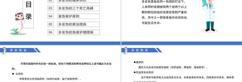 目 錄多發傷定義多發傷的臨床特點多發傷的三個死亡高峰緊急救護原則多發傷的救治措施多發傷的急救護理措施010203040506
