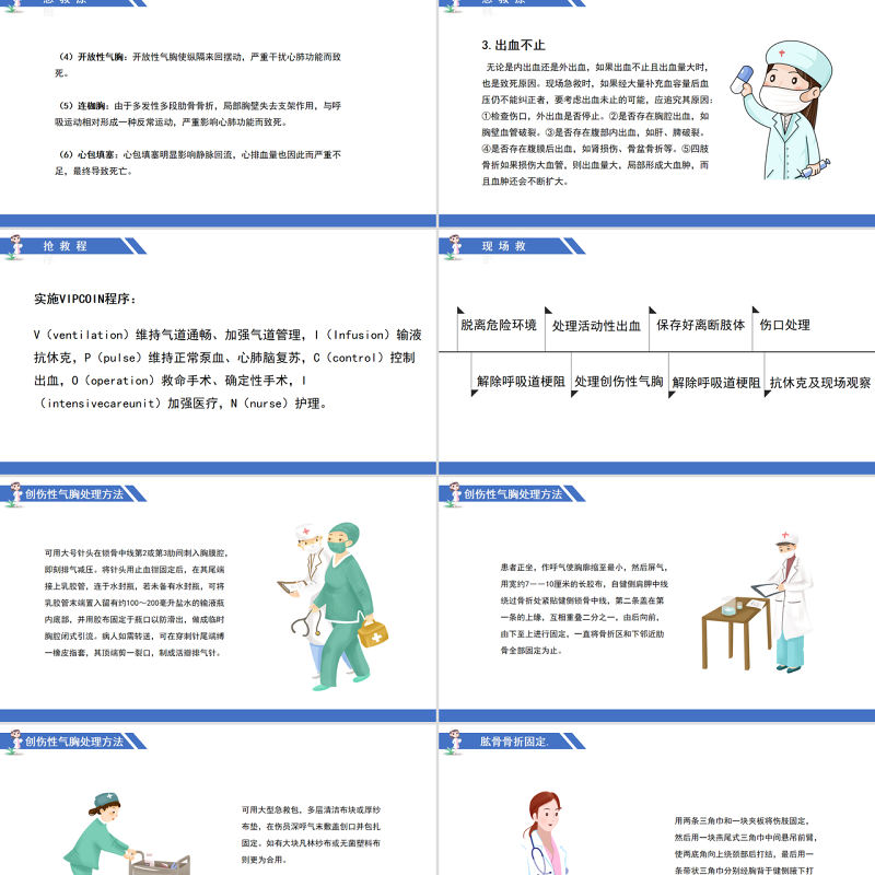 搶 救 程 序.實施VIPCOIN程序:V(ventilation)維持氣道通暢、加強氣道管理,I(Infusion)輸液抗休克,P(pulse)維持正常泵血、心肺腦復蘇,C(control)控制出血,O(operation)救命手術、確定性手術,I(intensivecareunit)加強醫療,N(nurse)護理。