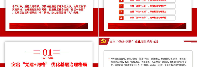> 黨課PPT模板 > 2023黨建引領(lǐng)網(wǎng)格化管理推動基層社會治理紅色精美黨建引領(lǐng)賦能小網(wǎng)格助力基層治理大提升工作匯報模板.PPTX 【圖片、文字、動畫均可編輯】