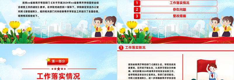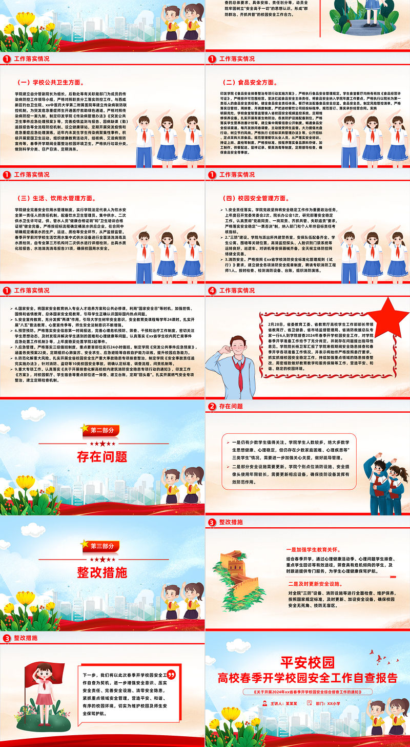 高校春季開學校園安全工作自查報告PPT簡潔大氣平安校園建設課件模板 Array