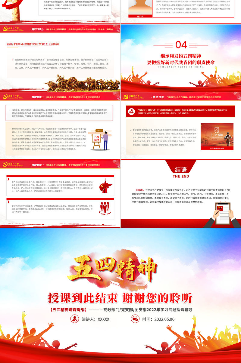 演講人:XXXXX時間:2022.05.06【五四精神講課提綱】————黨政部門/黨支部/團支部2022年學習專題授課輔導授課到此結束 謝謝您的聆聽