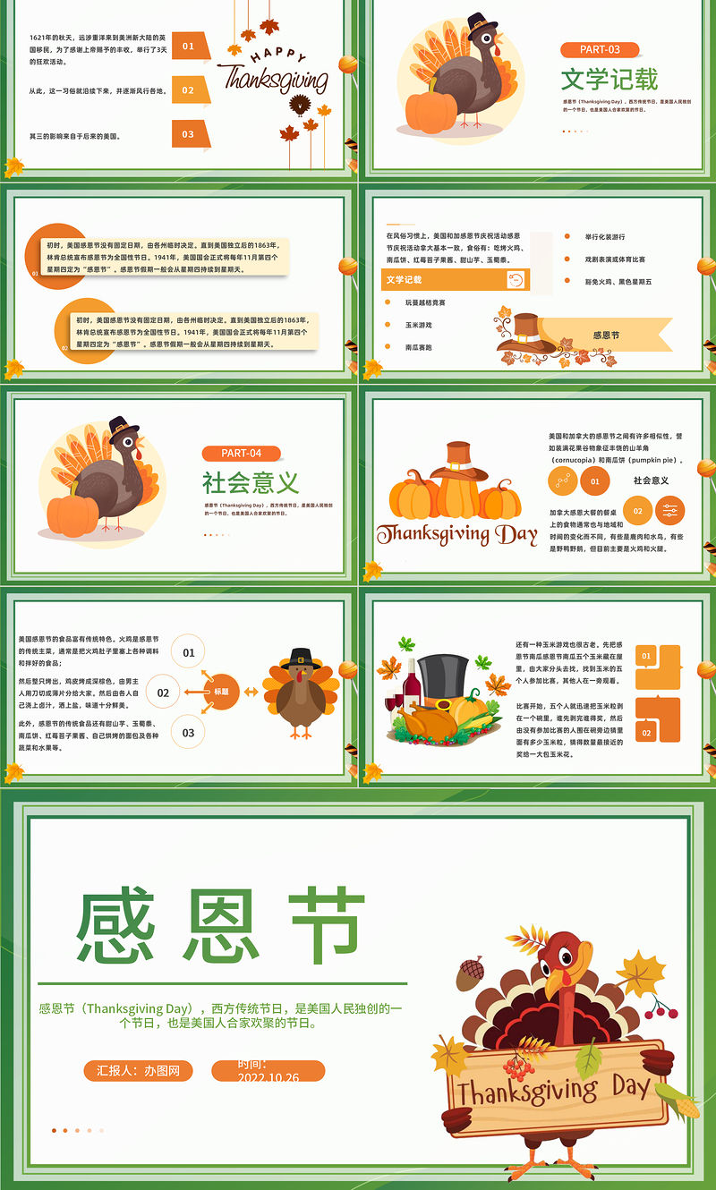 感恩節(Thanksgiving Day),西方傳統節日,是美國人民獨創的一個節日,也是美國人合家歡聚的節日。 感恩節匯報人:辦圖網時間:2022.10.26