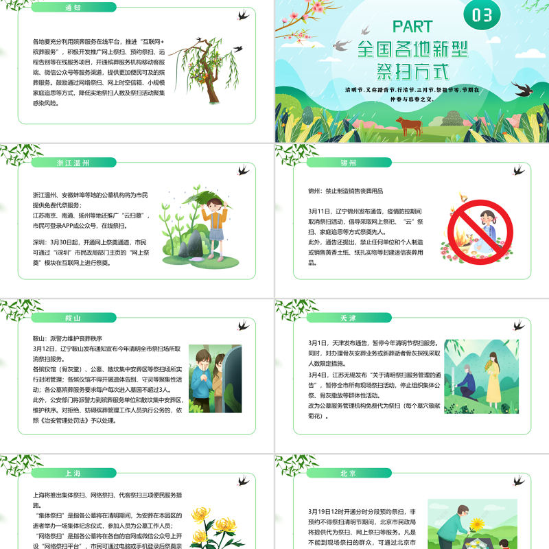 03PART全國各地新型祭掃方式清明節,又稱踏青節、行清節、三月節、祭祖節等,節期在仲春與暮春之交。