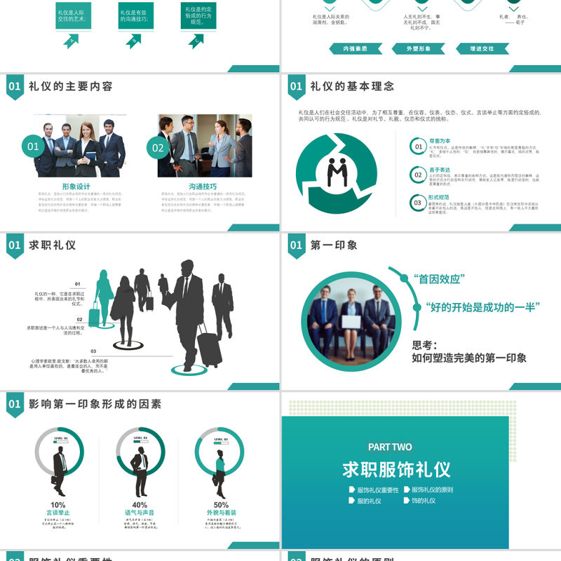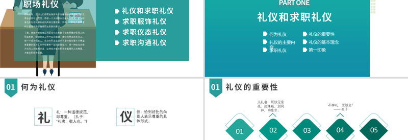 職場禮儀WORKPLACE ETIQUETTE職場禮儀,是指人們在職業(yè)場所中應(yīng)當(dāng)遵循的一系列禮儀規(guī)范。學(xué)會這些禮儀規(guī)范,將使一個人的職業(yè)形象大為提高。職業(yè)形象包括內(nèi)在的和外在的兩種主要因素,而每一個職場人都需要樹立塑造并維護(hù)自我職業(yè)形象的意識。CONTENTS目錄了解、掌握并恰當(dāng)?shù)貞?yīng)用職場禮儀有助于完善和維護(hù)職場人的職業(yè)形象,會使你在工作中左右逢源,使你的事業(yè)蒸蒸日上。做一個成功職業(yè)人。成功的職業(yè)生涯并不意味著你要才華橫溢,更重要的是在工作中你要有一定的職場技巧,用一種恰當(dāng)合理方式與人溝通和交流,這樣你才能在職場中贏得別人的尊重。才能在職場中獲勝。禮儀和求職禮儀求職服飾禮儀求職儀態(tài)禮儀求職溝通禮儀