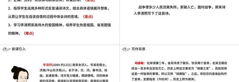 本課目標1.正確、流利、有感情地朗讀古詩,背誦古詩。(重點) 2.指導學生運用多種形式反復誦讀詩文,結合具體語境展開想象,從而讓學生在自讀自悟的過程中體會詩的意境。(重點) 3.學習李清照崇高偉大的愛國精神,培養學生熱愛祖國、奮發圖強的精神。(難點)