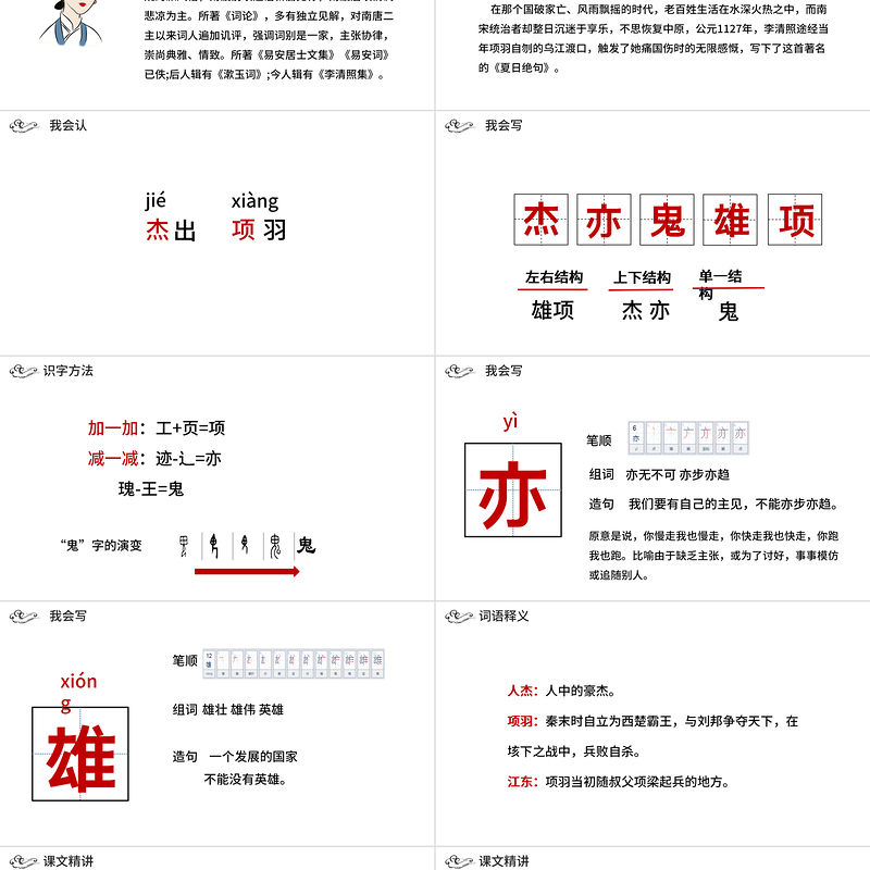課文精講 “生當作人杰,死亦為鬼雄。”詩的開頭兩句破空而起,勢如千鈞,先聲奪人地將那種生死都無愧為英雄豪杰的氣魄展現在讀者面前,讓人肅然起敬。這兩句詩是一種精髓的凝練,是一種氣魄的承載,是一種所向無懼的人生姿態,因其崇高的境界與非凡的氣勢成為千古傳誦的名句。詩的后兩句“至今思項羽,不肯過江東”,點出其原因所在。項羽最壯烈的舉動當屬因“無顏見江東父老”,放棄暫避江東重振旗鼓的精神而自殺身亡。在作者李清照看來,這種失敗中表現出來的異乎尋常的英雄氣概在宋廷南渡時尤顯可貴。詩人盛贊“不肯過江東”的精神,實因感慨時事,借史實來抒寫滿腔愛國熱情。“至今”兩字從時間與空間上將古與今、歷史與現實巧妙地勾聯起來,透發出借懷古以諷今的深刻用意。