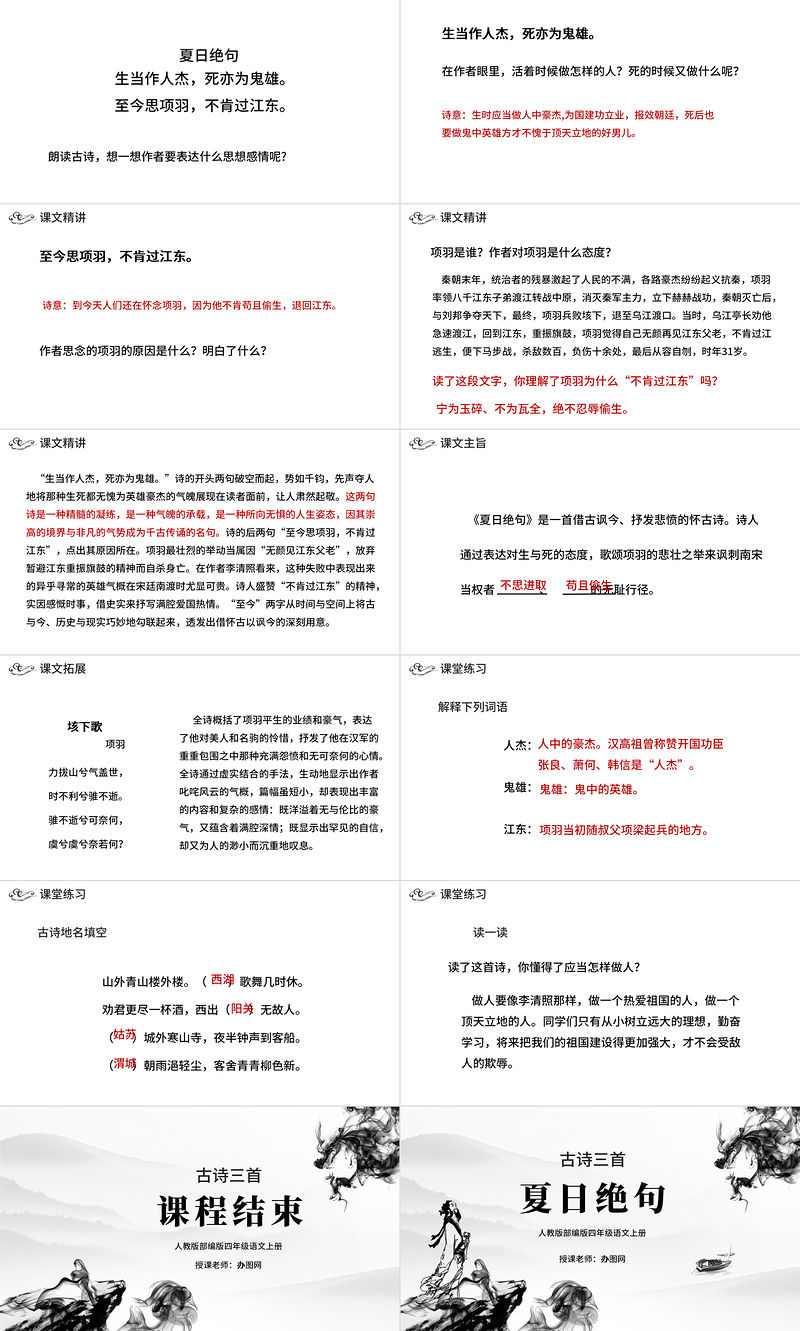 課文主旨 《夏日絕句》是一首借古諷今、抒發悲憤的懷古詩。詩人通過表達對生與死的態度,歌頌項羽的悲壯之舉來諷刺南宋當權者 、 的無恥行徑。不思進取茍且偷生