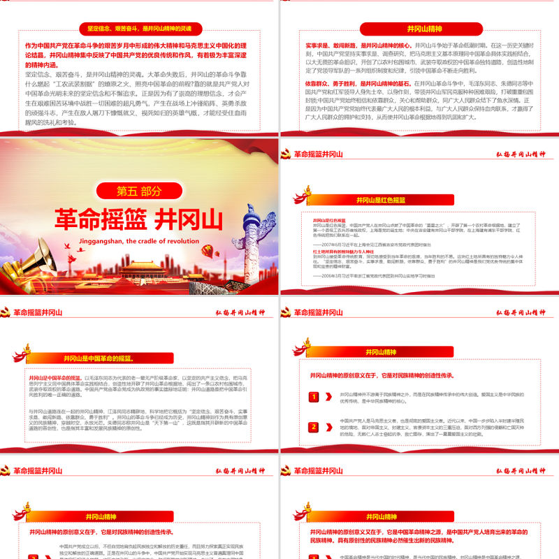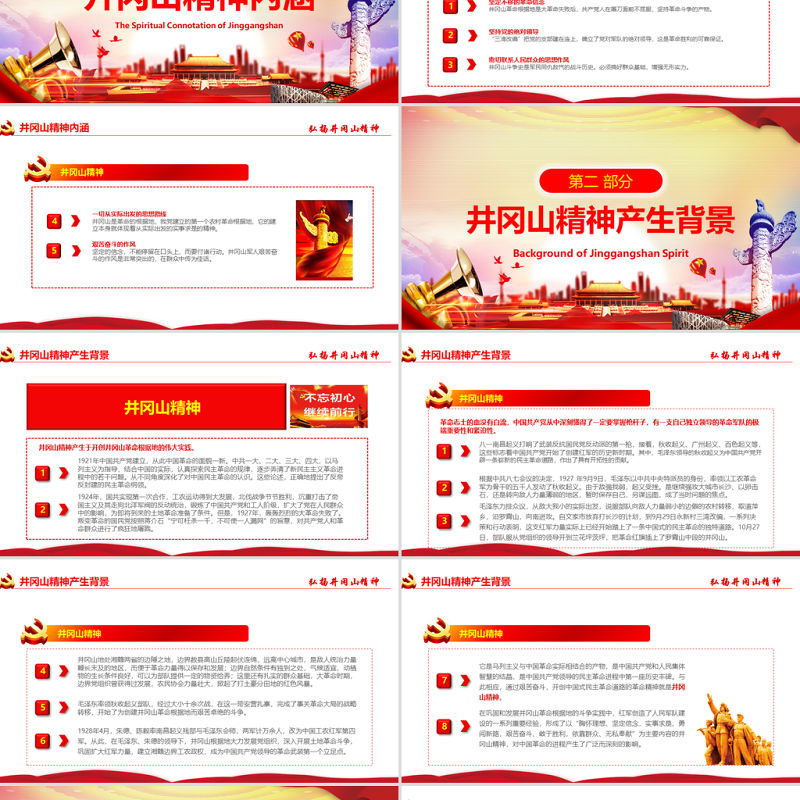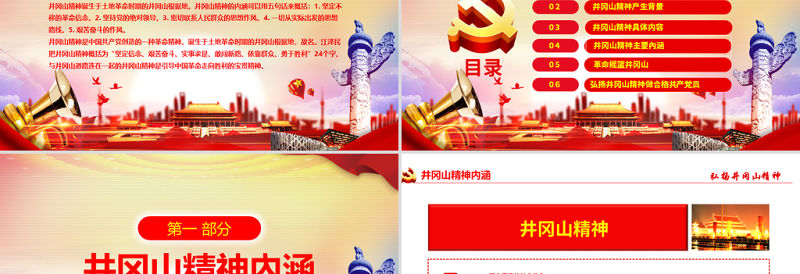 前言QIAN YAN井岡山精神誕生于土地革命時(shí)期的井岡山根據(jù)地。井岡山精神的內(nèi)涵可以用五句話來概括:1. 堅(jiān)定不移的革命信念。2. 堅(jiān)持黨的絕對(duì)領(lǐng)導(dǎo)。3. 密切聯(lián)系人民群眾的思想作風(fēng)。4. 一切從實(shí)際出發(fā)的思想路線。5. 艱苦奮斗的作風(fēng)。井岡山精神是中國(guó)共產(chǎn)黨創(chuàng)造的一種革命精神。誕生于土地革命時(shí)期的井岡山根據(jù)地,故名。**把井岡山精神概括為“堅(jiān)定信念、艱苦奮斗、實(shí)事求是、敢闖新路、依靠群眾、勇于勝利”24個(gè)字。與井岡山道路連在一起的井岡山精神是引導(dǎo)中國(guó)革命走向勝利的寶貴精神。