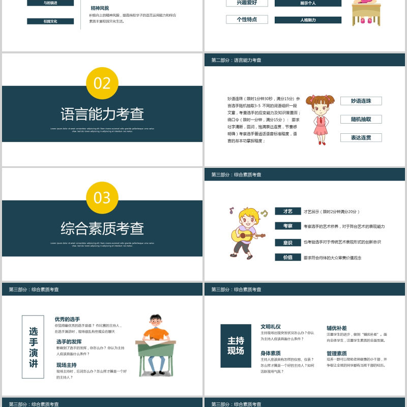 文明禮儀主持現場出現突發狀況怎么辦?你認為主持人應該具備什么條件?身體素質主持人應該具有怎樣的儀容、儀表?怎么樣才算是一個好的主持人?如何活躍現場氣氛?輔優補差注重學生的進步,做到“輔優補差”。面向全體學生,注重學生素質的全面發展。管理素質培養一群可以幫助老師做事的小干部,并爭取讓全班的同學都有當班干部的經歷。