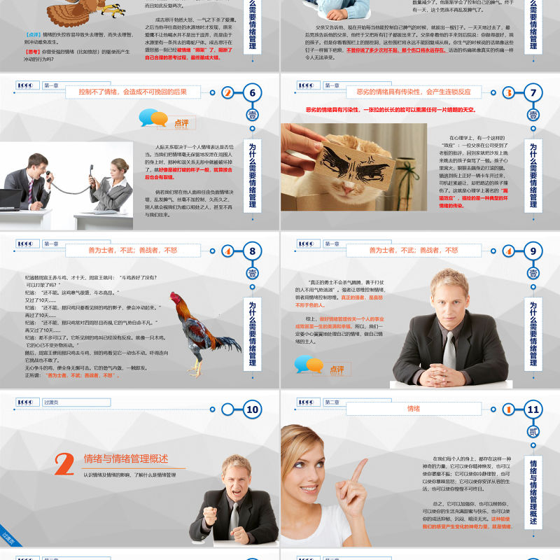 情緒管理許多人至今仍對(duì)情緒的重要性認(rèn)識(shí)不足。把情緒活動(dòng)緊緊看作是內(nèi)外部條件所引起的感情變化,是一種無關(guān)緊要的、暫時(shí)的精神狀態(tài),任其自然,很少進(jìn)行有意識(shí)的控制與調(diào)節(jié)。然而,人是感情動(dòng)物,人的思維、處事常受感情的牽引。因此,如果不能正確認(rèn)識(shí)到自己的情緒,并對(duì)情緒進(jìn)行疏導(dǎo)、調(diào)節(jié)與控制,往往會(huì)產(chǎn)生難以預(yù)料或不可挽回的惡劣后果。2你看,范進(jìn)苦讀而高中舉人,親眼看到喜報(bào)后,竟因歡喜過度而發(fā)了瘋;王朗被諸葛亮一番痛罵之后,盛怒之下竟跌馬倒地?cái)烂K匀藗儜?yīng)當(dāng)學(xué)會(huì)疏導(dǎo)、調(diào)節(jié)與控制自己的情緒。這就是情緒管理。也就是所謂的“先處理心情,再處理事情”。