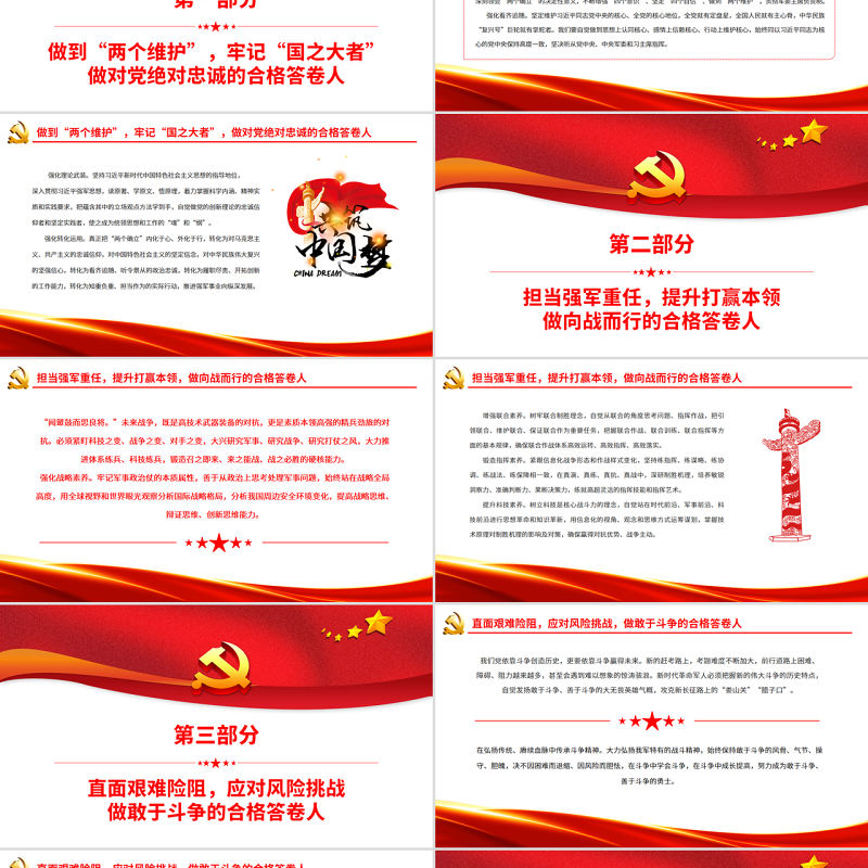 做到“兩個(gè)維護(hù)”,牢記“國之大者”,做對(duì)黨絕對(duì)忠誠的合格答卷人目 錄擔(dān)當(dāng)強(qiáng)軍重任,提升打贏本領(lǐng),做向戰(zhàn)而行的合格答卷人直面艱難險(xiǎn)阻,應(yīng)對(duì)風(fēng)險(xiǎn)挑戰(zhàn),做敢于斗爭的合格答卷人堅(jiān)持人民至上、踐行根本宗旨,做不負(fù)人民的合格答卷人牢記“兩個(gè)務(wù)必”,勇于自我革命,做遵規(guī)守紀(jì)的合格答卷人
