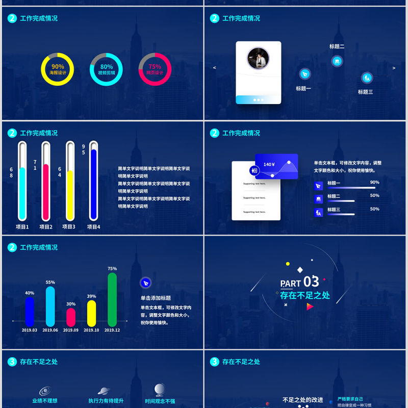 工作完成情況240%2019.032019.0655%2019.0930%2019.1039%2019.1275%單擊添加標題單擊文本框,可修改文字內(nèi)容,調(diào)整文字顏色和大小,祝你使用愉快。