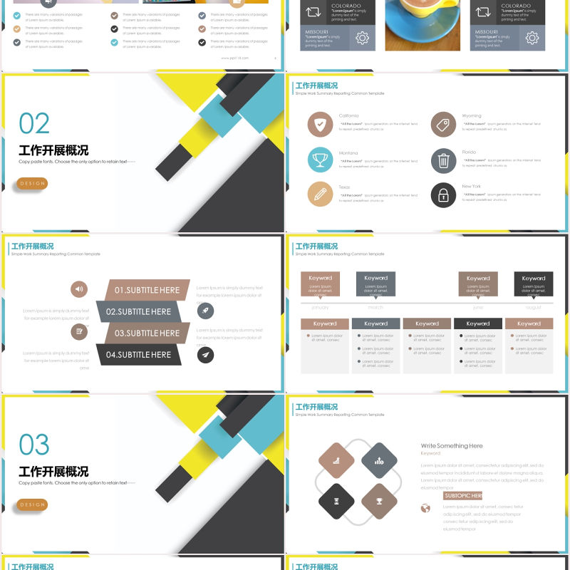 工作開展概況Simple Work Summary Reporting Common Template“All the Lorem” Ipsum generators on the Internet tend to repeat predefined chunks asCalifornia“All the Lorem” Ipsum generators on the Internet tend to repeat predefined chunks asMontana“All the Lorem” Ipsum generators on the Internet tend to repeat predefined chunks asTexas“All the Lorem” Ipsum generators on the Internet tend to repeat predefined chunks asWyoming“All the Lorem” Ipsum generators on the Internet tend to repeat predefined chunks asFlorida“All the Lorem” Ipsum generators on the Internet tend to repeat predefined chunks asNew York
