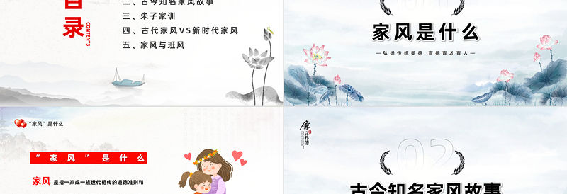 一、“家風(fēng)”是什么二、古今知名家風(fēng)故事三、朱子家訓(xùn)四、古代家風(fēng)VS新時代家風(fēng)五、家風(fēng)與班風(fēng)