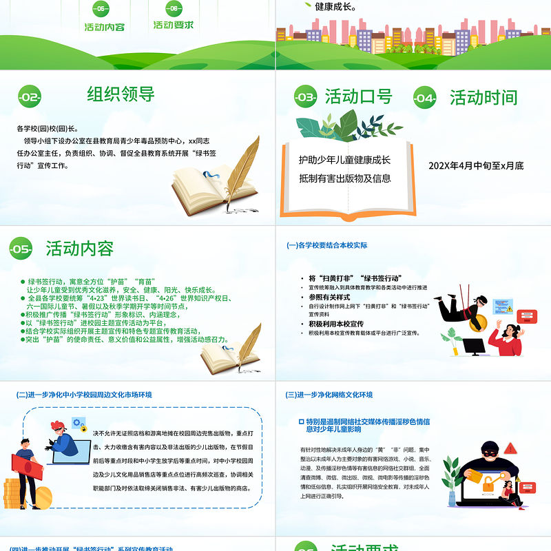 -05-活動內容綠書簽行動,寓意全方位“護苗”“育苗” 讓少年兒童受到優秀文化滋養,安全、健康、陽光、快樂成長。全縣各學校要統籌“4?23”世界讀書日、“4?26”世界知識產權日、 六一國際兒童節、暑假以及秋季學期開學等時間節點,積極推廣傳播“綠書簽行動”形象標識、內涵理念,以“綠書簽行動”進校園主題宣傳活動為平臺,結合學校實際組織開展主題宣傳和特色專題宣傳教育活動,突出“護苗”的使命責任、意義價值和公益屬性,增強活動感召力。
