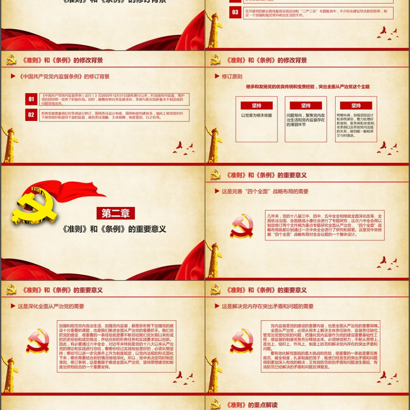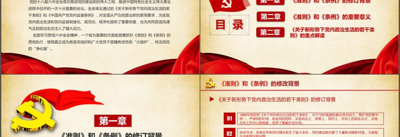 《準(zhǔn)則》和《條例》的修改背景《關(guān)于新形勢(shì)下黨內(nèi)政治生活的若干準(zhǔn)則》的修訂背景1980年制定的《關(guān)于黨內(nèi)政治生活的若干準(zhǔn)則》,對(duì)于當(dāng)時(shí)恢復(fù)和健全黨內(nèi)民主、維護(hù)黨的集中統(tǒng)一、嚴(yán)肅黨的紀(jì)律、促進(jìn)黨的團(tuán)結(jié),實(shí)現(xiàn)政治上、思想上、組織上、作風(fēng)上的撥亂反正,實(shí)現(xiàn)全黨工作中心的轉(zhuǎn)移,發(fā)揮了重要?dú)v史作用。30多年來(lái),形勢(shì)任務(wù)和黨內(nèi)情況發(fā)生了很大變化,黨的建設(shè)既積累了大量新成果新經(jīng)驗(yàn),又面臨許多新情況新問(wèn)題。在開(kāi)展黨的群眾路線教育實(shí)踐活動(dòng)和“三嚴(yán)三實(shí)”專(zhuān)題教育中,不少同志建議結(jié)合新的形勢(shì),制定一個(gè)加強(qiáng)和規(guī)范黨內(nèi)政治生活的文件。