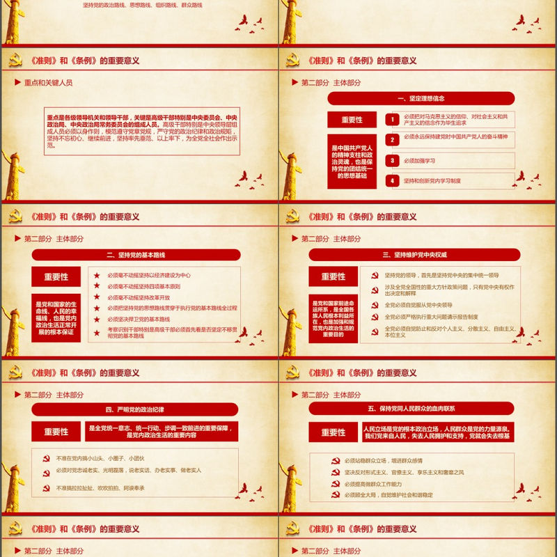 《準(zhǔn)則》和《條例》的重要意義重點(diǎn)和關(guān)鍵人員重點(diǎn)是各級(jí)領(lǐng)導(dǎo)機(jī)關(guān)和領(lǐng)導(dǎo)干部,關(guān)鍵是高級(jí)干部特別是中央委員會(huì)、中央政治局、中央政治局常務(wù)委員會(huì)的組成人員。高級(jí)干部特別是中央領(lǐng)導(dǎo)層組成人員必須以身作則,模范遵守黨章黨規(guī),嚴(yán)守黨的政治紀(jì)律和政治規(guī)矩,堅(jiān)持不忘初心、繼續(xù)前進(jìn),堅(jiān)持率先垂范、以上率下,為全黨全社會(huì)作出示范。