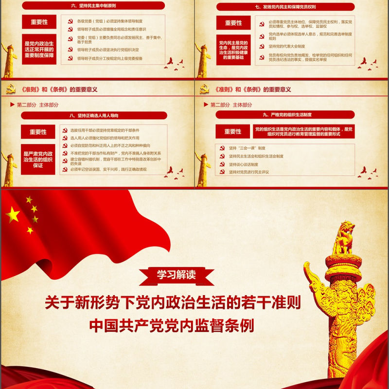 《準(zhǔn)則》和《條例》的重要意義第一部分 序言黨內(nèi)政治生活重大作用要管黨必須從黨內(nèi)政治生活管起,從嚴(yán)治黨必須從黨內(nèi)政治生活嚴(yán)起。1980年,黨的十一屆五中全會(huì)深刻總結(jié)歷史經(jīng)驗(yàn)特別是“文化大革命”的教訓(xùn),制定了《關(guān)于黨內(nèi)政治生活的若干準(zhǔn)則》,為撥亂反正、恢復(fù)和健全黨內(nèi)政治生活、推進(jìn)黨的建設(shè)發(fā)揮了重要作用,其主要原則和規(guī)定今天依然適用,要繼續(xù)堅(jiān)持。黨內(nèi)政治生活歷史經(jīng)驗(yàn)