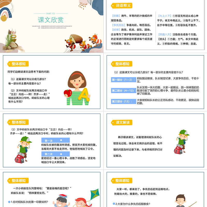 再仔細(xì)讀課文,試著理清螞蟻隊(duì)長(zhǎng)的心理變化過(guò)程,體會(huì)本文揭示出的道理。有不懂的問(wèn)題及時(shí)記錄下來(lái),與老師和同學(xué)們討論解決。課文解讀