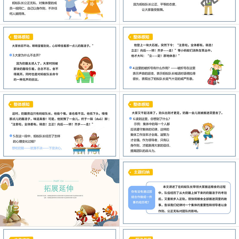 本文講述了在螞蟻隊(duì)長(zhǎng)帶領(lǐng)大家搬運(yùn)糧食的過(guò)程中,隊(duì)伍經(jīng)歷了從大奶酪上掉下來(lái)的奶酪渣子的考驗(yàn)后,又重新步入正軌,很快將糧食全部搬進(jìn)洞里的故事,告訴我們紀(jì)律對(duì)一個(gè)集體的重要性和領(lǐng)導(dǎo)者以身作則、公正無(wú)私對(duì)團(tuán)隊(duì)的影響。主題歸納你有沒(méi)有通過(guò)團(tuán)結(jié)合作做成一件事的經(jīng)歷呢?