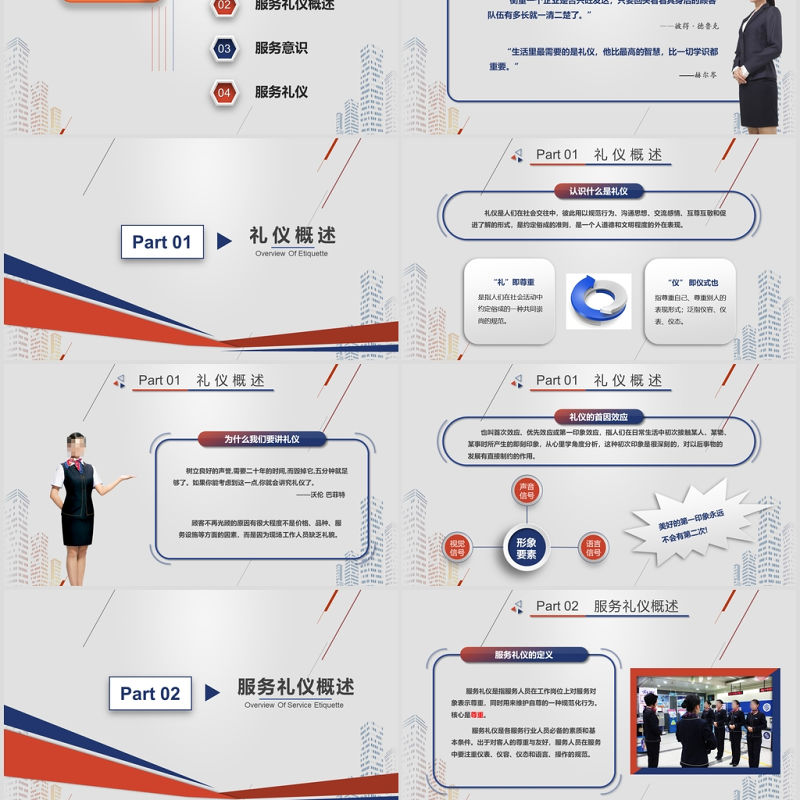 禮儀概述Part 01禮儀是人們在社會交往中,彼此用以規(guī)范行為、溝通思想、交流感情、互尊互敬和促進(jìn)了解的形式,是約定俗成的準(zhǔn)則,是一個人道德和文明程度的外在表現(xiàn)。