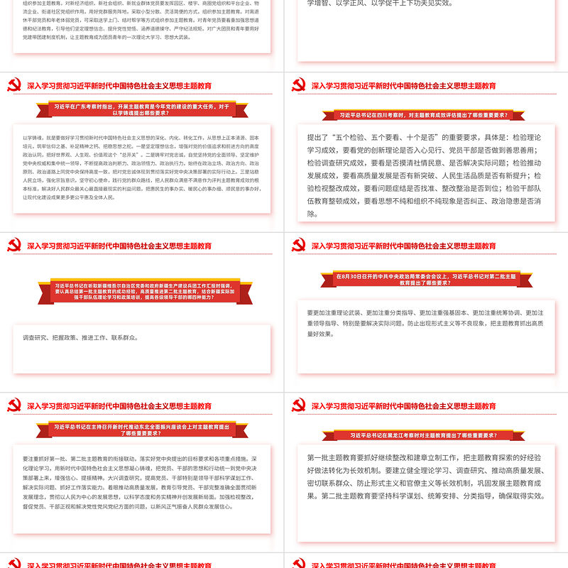 深入學(xué)習(xí)貫徹習(xí)近平新時代中國特色社會主義思想主題教育根據(jù)不同層級、不同對象實際,區(qū)分第二批主題教育單位不同情況,堅持因地制宜、分類指導(dǎo),不搞一刀切。市(地、州、盟)、縣(市、區(qū)、旗)及其直屬單位要聚焦樹立和踐行正確政績觀、提振精神、提升能力、轉(zhuǎn)變作風(fēng)等方面存在的突出問題進行檢視整改。鄉(xiāng)鎮(zhèn)、街道要著力解決推動政策落地、強化基層治理、為民辦事服務(wù)、化解社會矛盾、建強基層黨組織等方面突出問題。村、社區(qū)要圍繞鞏固脫貧攻堅成果、加快鄉(xiāng)村振興、提高基層治理能力、提升服務(wù)群眾質(zhì)效等開展主題教育。國有企業(yè)要聚焦加強黨的建設(shè)、增強科技創(chuàng)新驅(qū)動力,在推動企業(yè)不斷做強做優(yōu)做大上用力。學(xué)校要緊扣立德樹人根本任務(wù),在提高思想政治工作質(zhì)量、加強師德師風(fēng)建設(shè)方面下功夫。醫(yī)院要落實黨委領(lǐng)導(dǎo)下的院長負(fù)責(zé)制,凈化醫(yī)藥行業(yè)生態(tài),提高醫(yī)療服務(wù)水平。新經(jīng)濟組織、新社會組織、新就業(yè)群體要提高黨的組織和工作覆蓋質(zhì)量,增強黨組織政治功能和組織功能,推動黨員立足崗位多作貢獻。