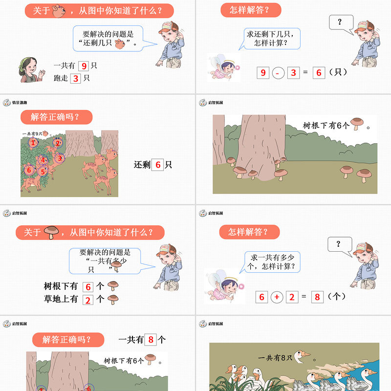 關(guān)于 ,從圖中你知道了什么?要解決的問(wèn)題是“還剩幾只 ”。一共有 只跑走 只93