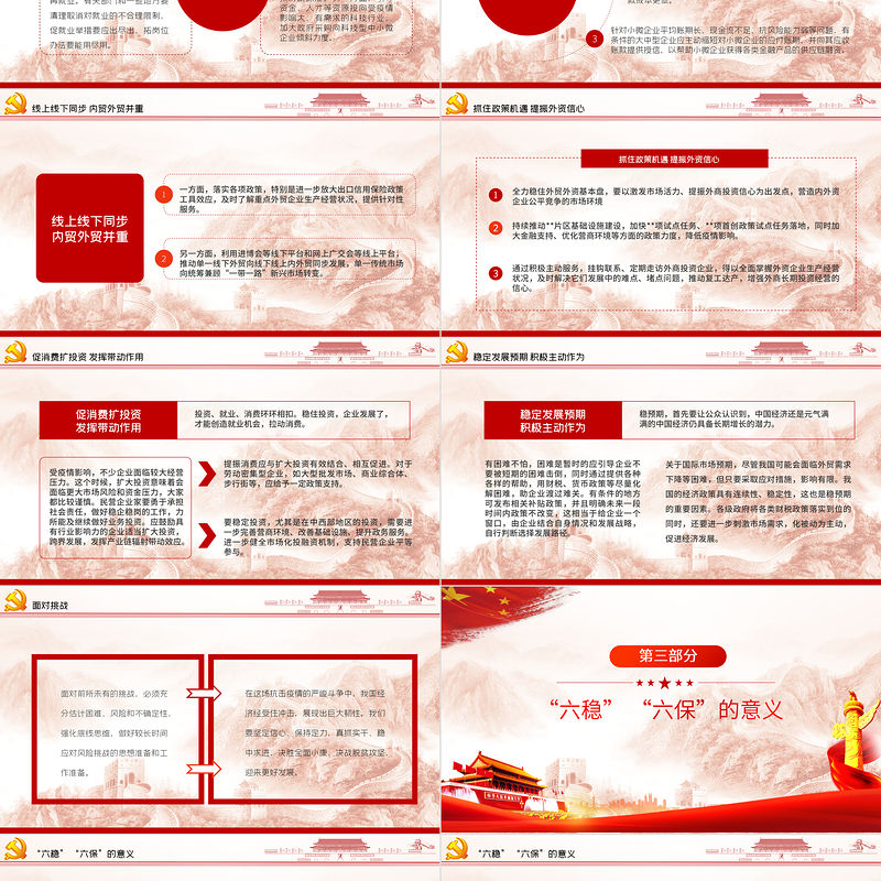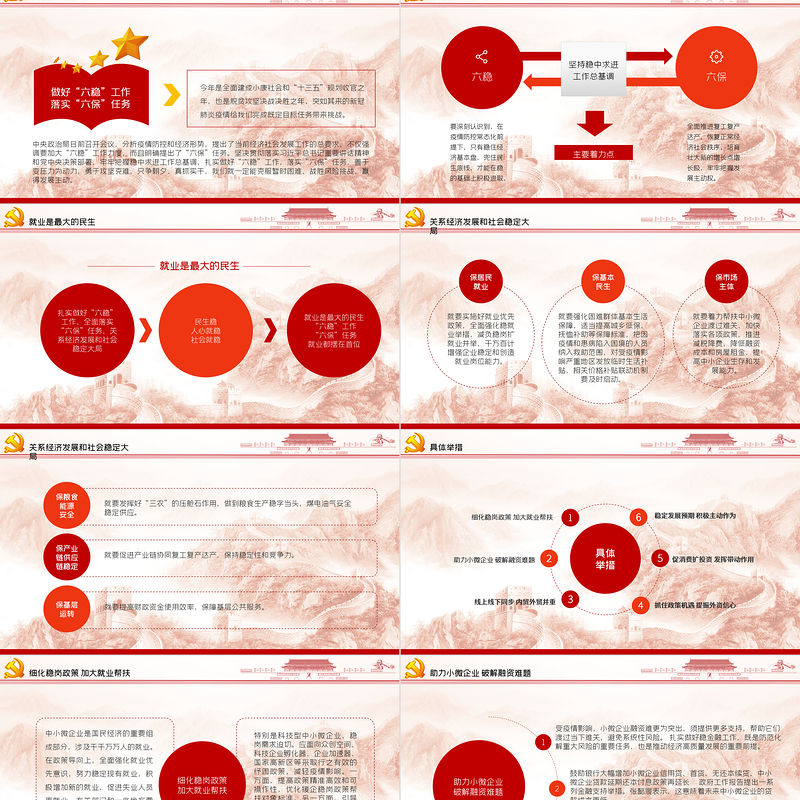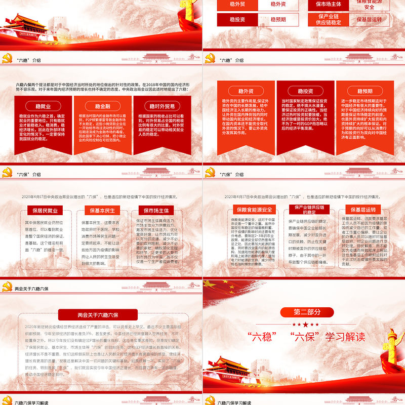 工圖網提供大氣紅色六穩(wěn)六保黨課學習PPT模板供會員免費下載。更多精彩黨課PPT素材,盡在工圖網。
