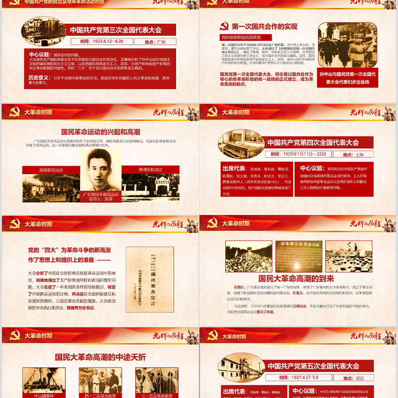 中國共產黨的創立及早年革命活動時期中國共產黨第三次全國代表大會時間:1923.6.12~6.20地點:廣州中心議題:國共合作的問題。大會接受共產國際執委會關于在中國實行國共合作的決議,正確地分析了孫中山反對帝國主義和封建軍閥的民主主義立場,以及把國民黨改造為工人、農民、小資產階級和資產階級的民主革命聯盟的可能性。黨的“三大”關于實行國共合作的政策是正確的。歷史意義:它對于加速中國革命的步伐,促進反帝反封建的人民大革命的高潮,具有重大的意義。 延時符
