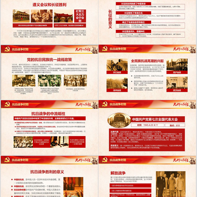 抗日戰爭時期中國共產黨第七次全國代表大會時間:1945.4.23-6.11地點:延安出席代表:正式代表547人,候補代表208人,代表全國121萬名黨員。主要內容:毛zd《論聯合政府》、朱德《論解放區戰場》、**《關于修改黨章的報告》、周恩來《論統一戰線》,大會總結了民主革命二十多年曲折發展的歷史經驗,制定了黨的路線,即放手發動群眾,壯大人民力量,在我黨的領導下,打敗日本侵略者,解放全國人民,建立一個新民主主義的中國。大會通過了新黨章,規定以馬克思列寧主義的理論與中國革命的實踐之統一的思想——毛zd思想,作為我們黨的一切工作的指針。歷史意義:是一次團結的大會、勝利的大會,它實現了全黨在馬克思列寧主義、毛zd思想和黨的路線的基礎上的團結,為抗日戰爭和民主革命的勝利做了充分的準備。 延時符