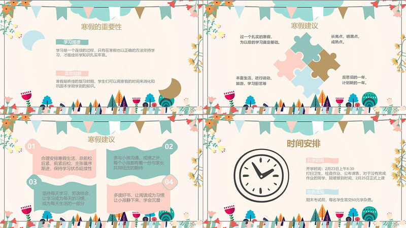 合理安排寒假生活,忌前松后緊、前緊后松,主張循序漸進,保持學習狀態延續性堅持每天學習,勞逸結合,讓學習成為每天的習慣,成為每天生活的一部分多讀好書,讓閱讀成為習慣讓小孩靜下來,學會沉潛多與小孩溝通,成績之外,每個小孩都有著一份與家長共同經歷的期待寒假建議