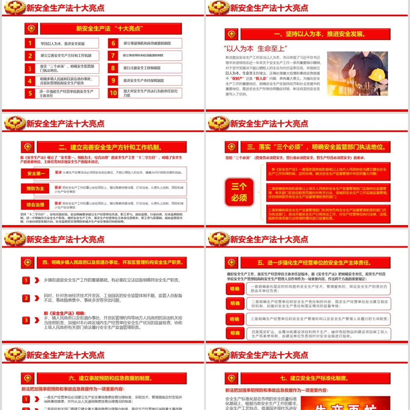 二、建立完善安全生產方針和工作機制。新《安全生產法》確立了“安全第一、預防為主、綜合治理”的安全生產工作“十二字方針”,明確了安全生產的重要地位、主體任務和實現安全生產的根本途徑。堅持“十二字方針”,總結實踐經驗,安法明確要求建立生產經營單位負責、職工參與、政府監管、行業自律、社會監督的機制,進一步明確各方安全生產職責。做好安全生產工作,落實生產經營單位主體責任是根本,職工參與是基礎,政府監管是關鍵,行業自律是發展方向,社會監督是實現預防和減少生產安全事故目標的保障。新安全生產法十大亮點