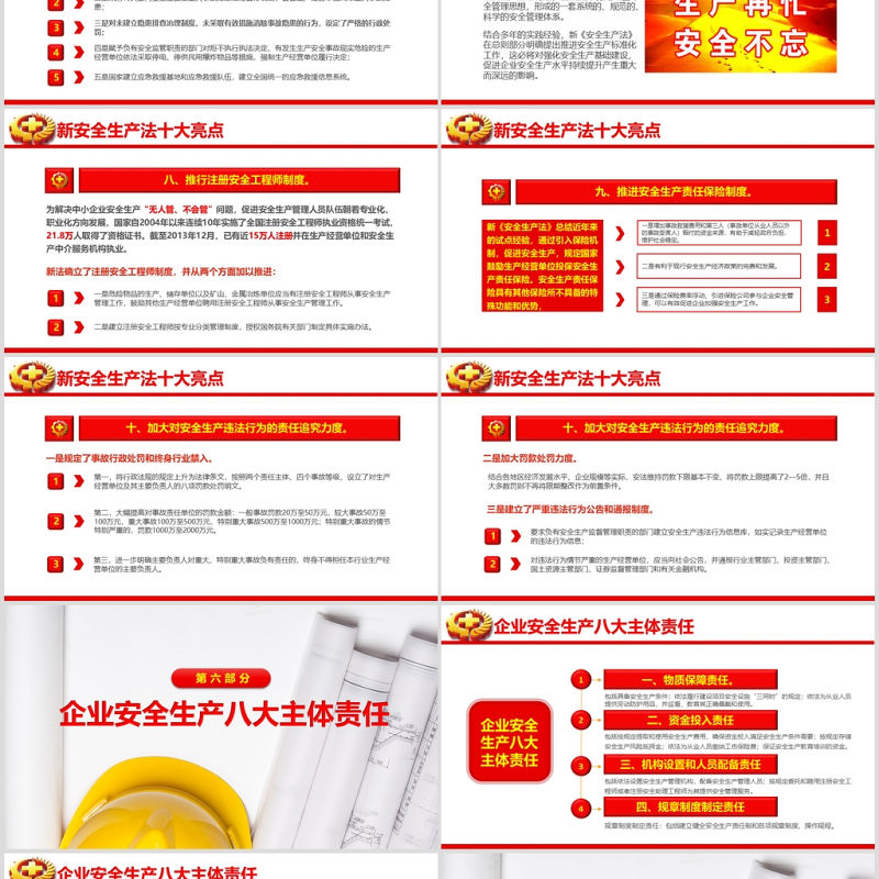 十、加大對安全生產違法行為的責任追究力度。1第一,將行政法規的規定上升為法律條文,按照兩個責任主體、四個事故等級,設立了對生產經營單位及其主要負責人的八項罰款處罰明文。2第二,大幅提高對事故責任單位的罰款金額:一般事故罰款20萬至50萬元,較大事故50萬至100萬元,重大事故100萬至500萬元,特別重大事故500萬至1000萬元;特別重大事故的情節特別嚴重的,罰款1000萬至2000萬元。一是規定了事故行政處罰和終身行業禁入。3第三,進一步明確主要負責人對重大、特別重大事故負有責任的,終身不得擔任本行業生產經營單位的主要負責人。新安全生產法十大亮點