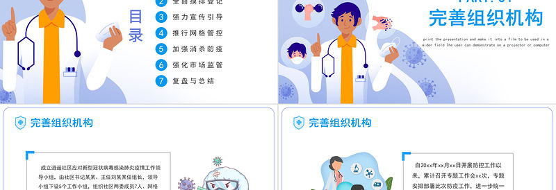 目錄7123456完善組織機(jī)構(gòu)全面摸排登記強(qiáng)力宣傳引導(dǎo)推行網(wǎng)格管控加強(qiáng)消殺防疫強(qiáng)化市場(chǎng)監(jiān)管復(fù)盤與總結(jié)