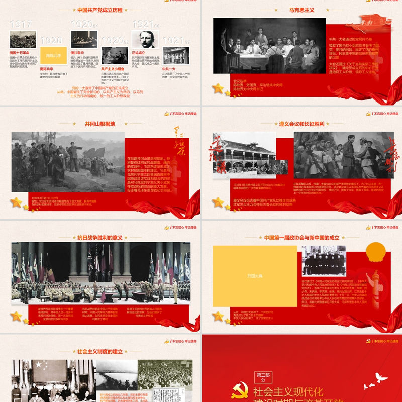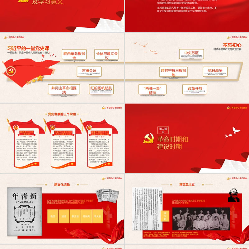 <p>不忘初心 牢記使命熱烈慶祝建黨100周年匯報(bào)人:黨政辦公室 時(shí)間:2021/X月</p><br><p>中國共產(chǎn)黨在近百年艱辛的奮斗歷史中,積累了大量的黨建經(jīng)驗(yàn)、斗爭經(jīng)驗(yàn)、執(zhí)政經(jīng)驗(yàn)、社會(huì)主義建設(shè)的經(jīng)驗(yàn)等,以及經(jīng)受挫折失敗的教訓(xùn),是我們寶貴的財(cái)富。這些經(jīng)驗(yàn)是幾代中國共產(chǎn)黨人的智慧結(jié)晶,是我們治黨治國的寶貴精神財(cái)富。認(rèn)真學(xué)習(xí)黨史既是一次把握規(guī)律、把握未來的理論學(xué)習(xí),也是一次堅(jiān)定信仰、堅(jiān)定方向的黨性教育。前言</p><br><p>目錄CONTENTS黨史發(fā)展脈絡(luò)及學(xué)習(xí)意義革命時(shí)期和建設(shè)時(shí)期社會(huì)主義現(xiàn)代化建設(shè)時(shí)期與改革開放走向新時(shí)代踏上新征程</p><br><p></p><br><p>歷史是最好的教科書,中國革命歷史是最好的營養(yǎng)劑。學(xué)習(xí)黨史、國史,是堅(jiān)持和發(fā)展中國特色社會(huì)主義、把黨和國家各項(xiàng)事業(yè)繼續(xù)推向前進(jìn)的必修課。在對(duì)歷史的深入思考中做好現(xiàn)實(shí)工作,更好走向未來,不斷交出堅(jiān)持和發(fā)展中國特色社會(huì)主義的合格答卷。</p><br><p>的一堂黨史課一部黨史,就是一部偉大壯闊的奮斗史!</p><br><p>不忘初心回顧中國共產(chǎn)黨的輝煌歷程</p><br><p>黨史發(fā)展的三個(gè)階段</p><br><p></p><br><p>新文化運(yùn)動(dòng)打破了封建思想的桎梏, 在中國社會(huì)中掀起了思想的啟蒙運(yùn)動(dòng),為馬克思主義的傳播奠定了基礎(chǔ) 魯迅李大釗胡適蔡元培陳獨(dú)秀</p><br><p>馬克思主義為中國共產(chǎn)黨的產(chǎn)生奠定了思想基礎(chǔ)在中國的廣泛傳播1918年10月,“五四”運(yùn)動(dòng)的主要領(lǐng)導(dǎo)者李大釗在“新青年”雜志上發(fā)表了《庶民的勝利》等文章,歌頌俄國工人階級(jí)的勝利。1919年9月,周恩來等在天津組織了覺悟社圖為部分社員1920年的合影。后排右一為周恩來,前排右三為鄧穎超李大釗</p><br><p>中國共產(chǎn)黨成立歷程黨的一大宣告了中國共產(chǎn)黨的正式成立從此,中國誕生了完全新式的、以共產(chǎn)主義為目的、以馬列主義為行動(dòng)指南的、統(tǒng)一的工人階級(jí)政黨南陳北李</p><br><p>馬克思主義中共一大會(huì)通過的黨綱共15條吸取了國內(nèi)黨小組黨綱并參考了俄、英、美共的綱領(lǐng),規(guī)定了黨的奮斗目標(biāo)、民主集中制的組織原則和黨的紀(jì)律大會(huì)還通過《關(guān)于當(dāng)前實(shí)際工作的決議》,確定黨成立后的中心任務(wù)是組織工人階級(jí),領(lǐng)導(dǎo)工人運(yùn)動(dòng)。會(huì)議選舉陳獨(dú)秀、張國燾、李達(dá)組成中央局陳獨(dú)秀為中央局書記</p><br><p>井岡山根據(jù)地在創(chuàng)建井岡山革命根據(jù)地,特別是在紅四軍轉(zhuǎn)戰(zhàn)贛南、閩西的實(shí)踐中,毛zd逐漸形成了農(nóng)村包圍城市的理論,它是馬克思列寧主義的普遍真理同中國革命具體實(shí)踐相結(jié)合的典范,是對(duì)馬克思列寧主義關(guān)于武裝奪取政權(quán)的理論的重大發(fā)展,標(biāo)志著毛zd思想的初步形成。1929年1月到1931年9月各地工農(nóng)紅軍和農(nóng)村革命根據(jù)地有了很大發(fā)展,具有中國特色的農(nóng)村包圍城市,武裝奪取政權(quán)的革命道路基本形成。</p><br><p>遵義會(huì)議和長征勝利在紅軍第五次反“圍剿”失敗和長征初期嚴(yán)重受挫的情況下,為了糾正王明“左”傾領(lǐng)導(dǎo)在軍事指揮上的錯(cuò)誤而召開。這次會(huì)議確立以毛zd為代表的馬克思主義正確路線在中共中央的領(lǐng)導(dǎo)地位,挽救了黨、挽救了紅軍、挽救了革命,是黨的歷史上一個(gè)生死攸關(guān)的轉(zhuǎn)折點(diǎn)。1935年1月在貴州遵義召開的獨(dú)立自主地解決中國革命問題的一次極其重要的會(huì)議。遵義會(huì)議標(biāo)志著中國共產(chǎn)黨從幼稚走向成熟紅軍三大主力會(huì)師標(biāo)志著長征的勝利結(jié)束</p><br><p>抗日戰(zhàn)爭勝利的意義是世界反法西斯戰(zhàn)爭的一個(gè)重要組成部分,是中國人民一百多年來反對(duì)外敵侵略,第一次取得完全勝利的民族解放戰(zhàn)爭抗日戰(zhàn)爭時(shí)期是中國共產(chǎn)黨成熟時(shí)期,中國人民革命力量得到空前大發(fā)展,為民主革命在全國勝利奠定了基礎(chǔ)促進(jìn)了亞洲和世界各國人民民族解放運(yùn)動(dòng)的發(fā)展,為他們提供了寶貴的斗爭經(jīng)驗(yàn)</p><br><p>中國第一屆政協(xié)會(huì)與新中國的成立會(huì)議通過了《中國人民政治協(xié)商會(huì)議共同綱領(lǐng)》、《中華人民共和國中央人民政府組織法》和《中國人民政治協(xié)商會(huì)議組織法》。選舉產(chǎn)生毛zd為中央人民政府主席,朱德、**、宋慶齡、李濟(jì)源、張瀾、高崗為副主席,以及由五十六人組成的中央人民政府委員會(huì);十月一日,中央人民政府委員會(huì)任命周恩來為中央人民政府政務(wù)院總理兼外交部長;同日,首都北京隆重舉行開國大典,毛zd宣告中華人民共和國的成立。 從此,中國歷史開辟了一個(gè)新的時(shí)代真正成為了獨(dú)立自主的國家中國人民站起來了,成了國家的主人開國大典</p><br><p>社會(huì)主義制度的建立1953年黨中央提出過渡時(shí)期總路線