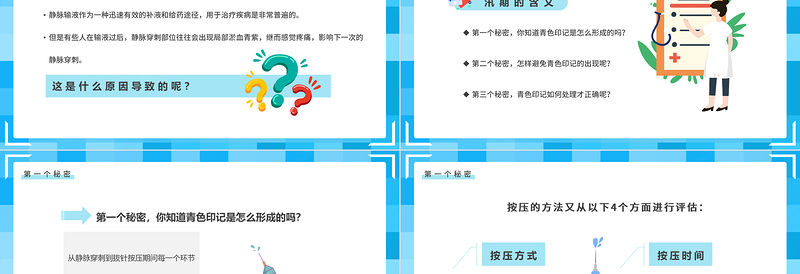 第二個秘密第二個秘密,怎樣避免青色印記的出現呢?所穿刺靜脈的解剖特點及其與之相伴行的動脈間的解剖關系,根據解剖特點進行操作如一側穿刺不成功,可改為對側,禁止在原穿刺點反復穿刺,以避免出現血腫,局部隆起疑有血腫應立即停止穿刺,拔針后局部加壓止血。