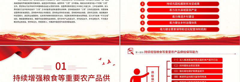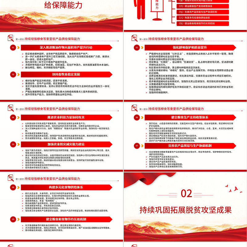 第一部分-持續增強糧食等重要農產品供給保障能力延時符(一)深入推進糧油作物大面積單產提升行動(二)扶持畜牧業穩定發展(三)強化耕地保護和質量提升(四)推進農業科技力量協同攻關(五)加強農業防災減災能力建設(七)完善農產品貿易與生產協調機制(九)健全糧食和食物節約長效機制(六)健全糧食生產支持政策體系(八)構建多元化食物供給體系