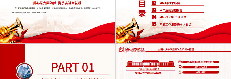 全國人大十四屆三次會(huì)議基本概況NPC&CPPCC 2025全國兩會(huì)全國人大十四屆三次會(huì)議 召開時(shí)間:2025年3月5日至3月11日北京·人民大會(huì)堂會(huì)期:6天半3月10日