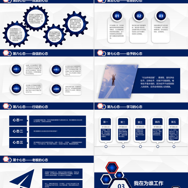 第八心態——行動的心態行動是最有說服力的。千百句美麗的雄辯勝不過真實的行動。我們需要用行動去證明自己的存在,證明自己的價值;心態一我們需要用行動去真正的關懷我們的客戶心態二我們需要用行動去完成我們的目標。如果一切計劃、一切目標、一切愿景都是停留在紙上,不去付諸行動,那計劃就不能執行,目標就不能實現,愿景就是肥皂泡。心態三