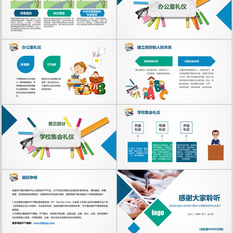 感謝大家聆聽適合幼兒園/小學(xué)/初中/高中/大學(xué)教師老師禮儀設(shè)計匯報人:辦圖網(wǎng) 部門:設(shè)計部logo(含配套WORD文稿)