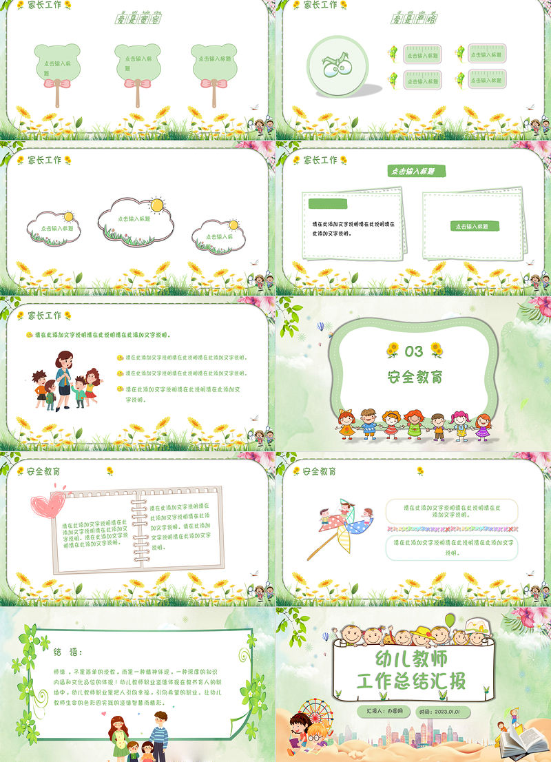 2023綠色小清新卡通幼兒園教師年終工作計劃總結PPT模板