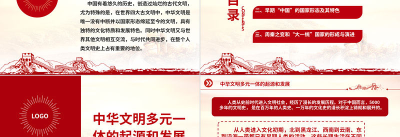 中國有著悠久的歷史,創造過燦爛的古代文明,尤為特殊的是,在世界四大古文明中,中華文明是唯一沒有中斷并以國家形態綿延至今的文明,具有獨特的文化特質和發展特色。同時中華文明又與世界其他文明相互交流,與時代共同進步,在整個人類文明史上占有重要的地位。前 言LOGO